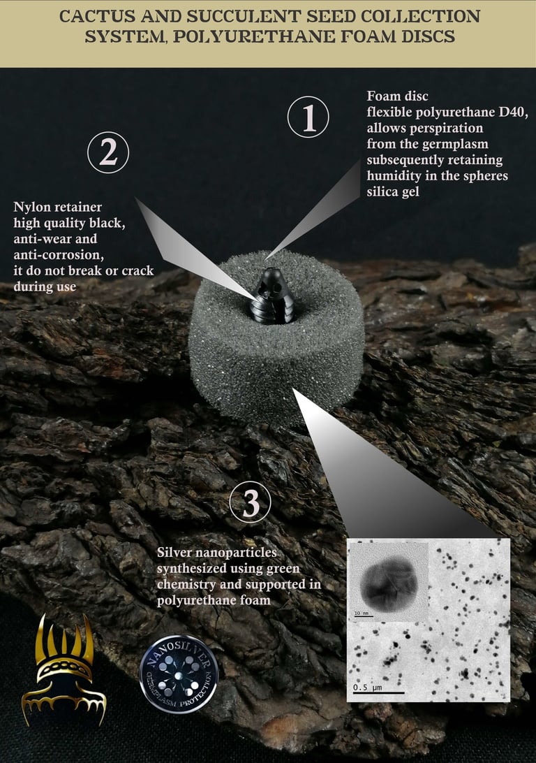 The antimicrobial activity of silver nanoparticles has been widely documented in recent years. These nanometric-sized metal particles (millionths of a millimeter) have been shown to have high activity in destroying microorganisms and delaying their proliferation, which is why they have been used as a protective coating. in various types of materials. Using green chemistry techniques we have developed a new method to synthesize this type of silver nanomaterial with the purpose of exercising its protective activity in the field of germplasm storage under the brand Nanosilver Germplasm Protection, for this the silver nanoparticles are immobilized in disks of flexible polyurethane foam. These polyurethane discs supported with silver nanoparticles with an average size of 30 nm promote fungistatic and fungicidal activity, destroying the membrane of phytopathogenic fungi and at the same time stopping their growth on the collected seeds and fruits, allowing better storage of the germplasm.