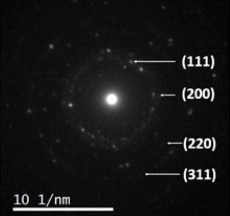 Selected area electron diffraction of silver nanoparticles demonstrating the crystalline nature of the nanomaterial synthesized by green chemistry.