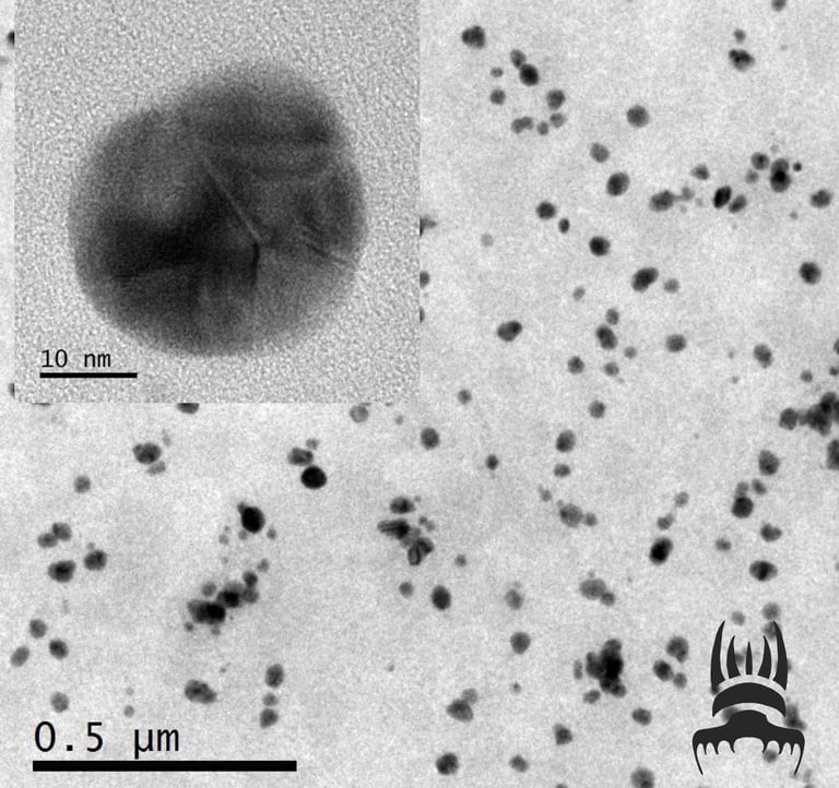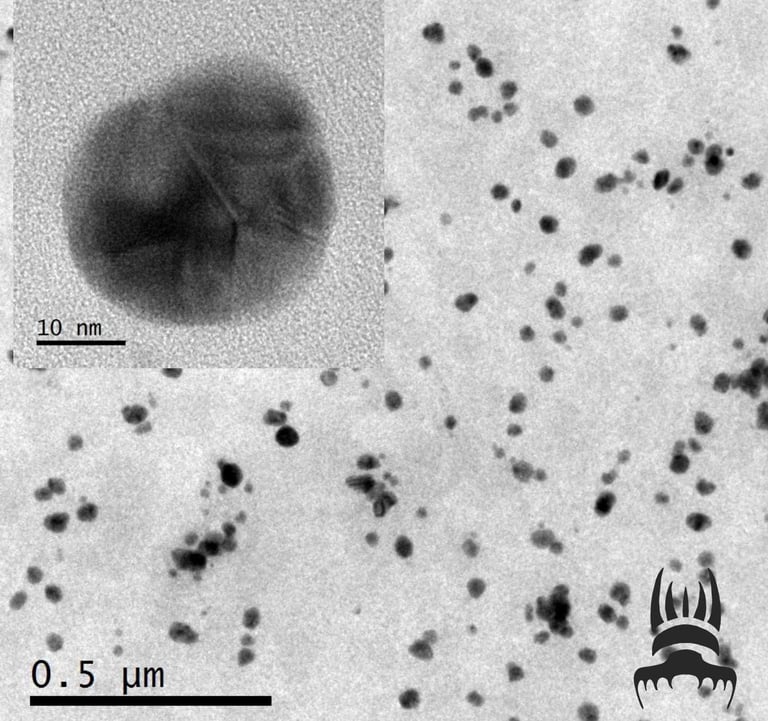 Micrografía electrónica de transmisión (TEM) de las nanopartículas de plata con tamaño promedio de 30 nm sintetizadas mediante química verde.