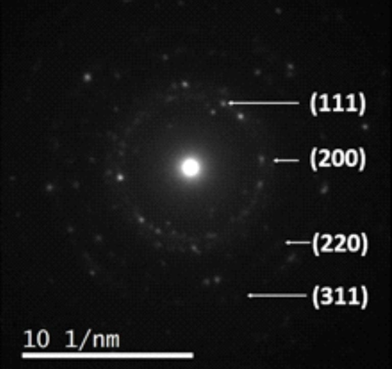 Difracción electrónica de área seleccionada de nanopartículas de plata demostrando la naturaleza cristalina del nanomaterial sintetizado mediante química verde.