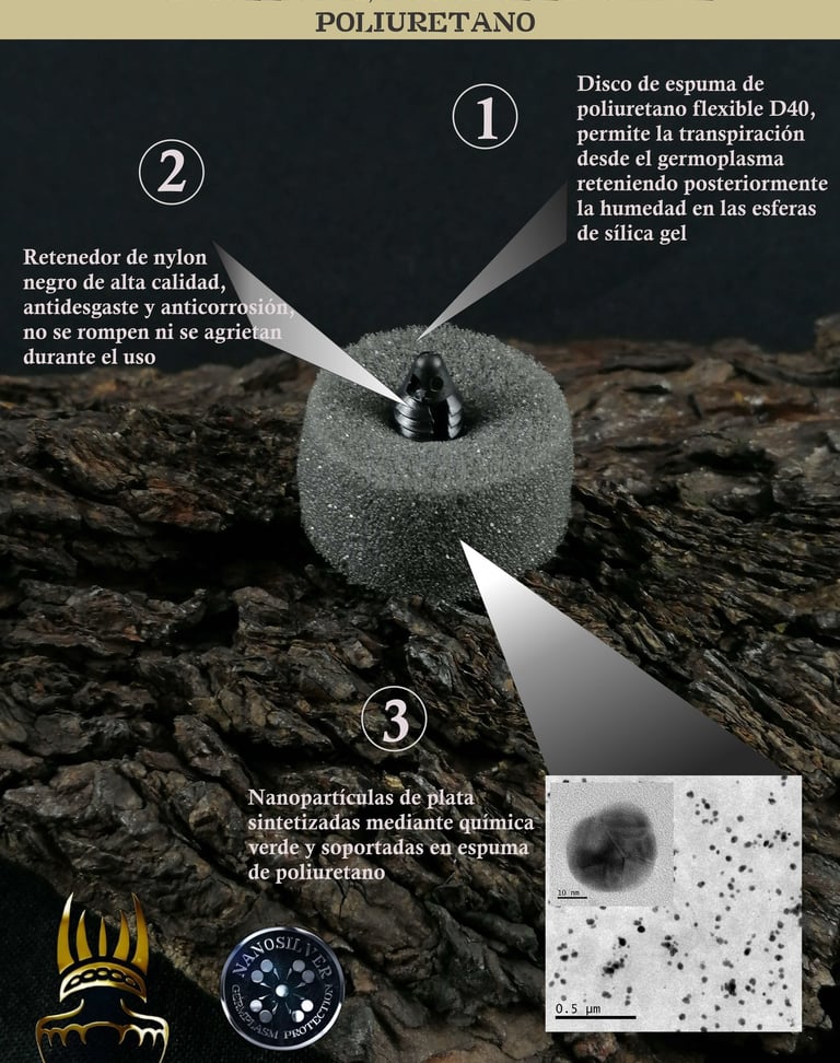 La actividad antimicrobiana de las nanopartículas de plata se ha documentado ampliamente en años recientes, estas partículas metálicas de tamaño nanométrico (millonésimas de milímetro) han demostrado presentar una alta actividad para destruir microorganismos y retrasar su proliferación, por lo cual se han utilizado como recubrimiento protector en diversos tipos de materiales. Utilizando técnicas de química verde hemos desarrollado un nuevo método para sintetizar este tipo de nanomaterial de plata con la finalidad de ejercer su actividad protectora en el campo de almacenaje de germoplasma bajo la marca Nanosilver Germplasm Protection, para ello las nanopartículas de plata son inmovilizadas en discos de espuma de poliuretano flexible. Estos discos de poliuretano soportados con nanopartículas de plata de tamaño promedio de 30 nm promueven una actividad fungistática y fungicida, destruyendo la membrana de hongos fitopatógenos y deteniendo al mismo tiempo su crecimiento sobre las semillas y frutos colectados, permitiendo un mejor almacenaje del germoplasma.